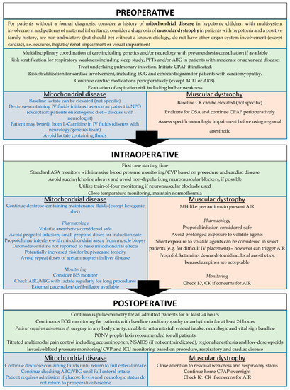 Perioperative framework for management of patients with neuromuscular disorders with specific considerations for mitochondrial disease and muscular dystrophies. PFT: pulmonary function test, ABG: arterial blood gas, CPAP: continuous positive airway pressure, ECG: electrocardiogram, ACEI: angiotensin-converting enzyme inhibitor, ARB: angiotensin II receptor blocker, NPO: nil per os; OSA: obstructive sleep apnea; CVP: central venous pressure; AIR: anesthesia-induced rhabdomyolysis, BIS: Bispectral index, PONV: post-operative nausea and vomiting, ICU: intensive care unit, VBG: venous blood gas, NSAIDS: non-steroidal anti-inflammatory drugs.