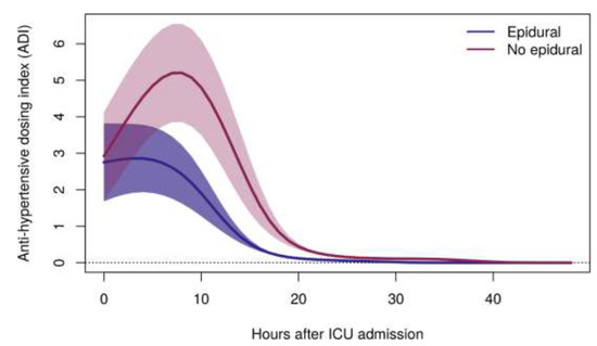 Mean ADI with 95% confidence band through 48 h after ICU admission for children undergoing coarctation repair via thoracotomy with and without epidurals, adjusted to the typical patient (age = 5.9 years; sex = male; weight = 23.1 kg; preoperative anti-hypertensive use = TRUE; preoperative systolic hypertension z-score = 2.95; preoperative SBP arm-leg gradient = 29 mm Hg; preoperative aortic isthmus z-score = −3.74). ADI = anti-hypertensive dosing index, a metric incorporating dose and duration of all anti-hypertensive infusions by determining the dose of each anti-hypertensive infusion, expressed as a multiple of the standard initial dose, multiplied by the total duration of each infusion at each dose; ICU = intensive care unit; SBP = systolic blood pressure. p < 0.001.