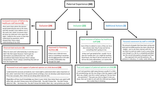 Flow chart depicting the paternal experience within the healthcare setting categorized into exclusion, inclusion, and additional actions. The bolded number represents the amount of extracted codes identified to match the respective theme, and the italics below each theme are specific quotations taken from paternal interviews.