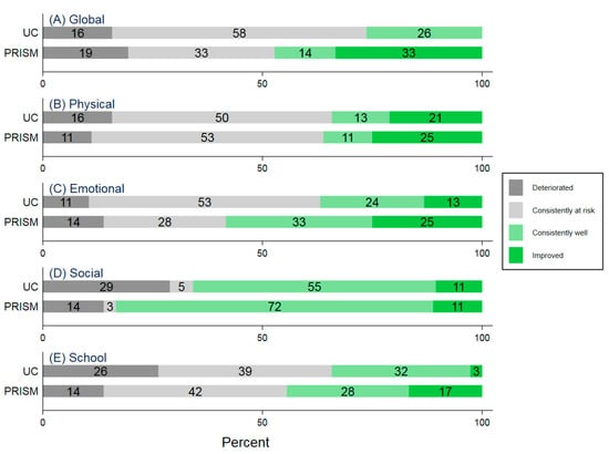 The mean baseline SF-15 Total Score was 59 (SD 21) for UC and 62 (SD 16) for PRISM (Supplementary Materials Table S1). Scores at six months were 60 (SD 19) for UC and 67 (SD 15) for PRISM. Compared to UC, participants who received PRISM had a higher proportion of positive long-term global HRQOL trajectories (PRISM = 47%, 95% CI: 32–63 vs. UC = 26%, 95% CI: 15–42) (Table 2, Figure 1). More PRISM recipients than UC recipients improved (PRISM: 33% vs. UC: 0%). The mean change among participants with improved scores was +26 (SD 12) and the minimum change in this group was +4. Similarly, the mean change for the group of participants whose scores declined was −26 (SD 15), with the minimum change −7. Across all three psychosocial subdomains, more participants who received PRISM had positive trajectories (emotional: PRISM = 58% vs. UC = 37%; social: PRISM = 83% vs. UC = 66%; school: PRISM = 45% vs. UC = 35%). The proportion with positive physical subdomain trajectories was similar across study arms (PRISM: 36% vs. UC: 34%).