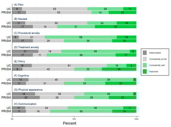 The mean baseline Cancer Module Total Score was 65 (SD 17) for UC and 66 (SD 16) for PRISM (Supplementary Materials Table S1). Mean scores at six months were 64 (SD 20) for UC and 72 (SD 11) for PRISM. Compared to UC, the proportion of participants with positive trajectories was higher for PRISM recipients in the nausea, treatment anxiety, worry, cognitive, physical appearance, and communication subdomains (nausea: PRISM = 64% vs. UC = 39%; treatment anxiety: PRISM = 72% vs. UC = 61%; worry: PRISM = 50% vs. UC = 24%; cognitive: PRISM = 58% vs. UC = 42%, physical appearance: PRISM = 50% vs. UC = 42%; communication: PRISM = 69% vs. UC = 55%) (Table 2, Figure 2). The greatest advantage was observed in nausea, worry, and cognitive domains. At least 50% of PRISM recipients had positive trajectories in seven of the eight subdomains, compared to three out of eight subdomains for UC recipients (Figure 2).