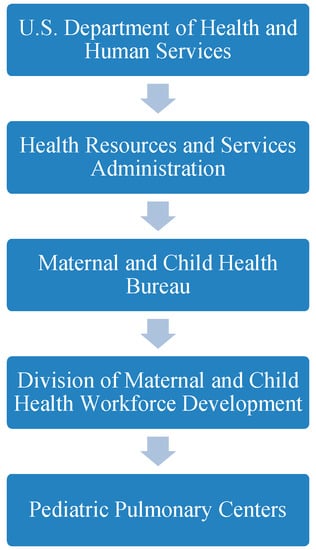 The development of future maternal child health (MCH) professionals is recognized through various workforce development initiatives, including those supported by the Health Resources and Services Administration (HRSA). The HRSA serves as the primary U.S. agency responsible for improving health care for people that are vulnerable. Vulnerability may result from geographic isolation, economic hardships, or medically vulnerable people. The HRSA strives, “to improve health outcomes and address health disparities through access to quality services, a skilled health workforce, and innovative, high-value programs” [7,8]. To achieve the goals set forth by the HRSA, this governing agency contributes to the training of health professionals to distribute providers in the areas in the most need. Functioning under the HRSA, the Maternal and Child Health Bureau (MCHB) envisions, “an America where all children and families are healthy and thriving and have a fair shot at reaching their fullest potential” [8]. The MCHB implements various programs focusing on specialty areas of maternal/women’s health, adolescent/young adult health, perinatal/infant health, children with special health care needs, and child health to accomplish the organization’s intentions. Pediatric Pulmonary Centers (PPCs) are funded projects under the Division of Maternal Child Health, Workforce Development, which prepares future health care professionals to develop or improve community-based, family-centered health care for children with chronic respiratory diseases such as cystic fibrosis and asthma (Figure 1) [9,10,11,12,13].