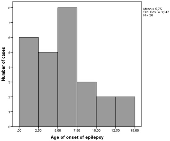 The onset of epilepsy varied from 1 month to 14 years of age, but prevailed before 7 years of age. The onset was in the first year of life in four of 26 patients. The age distribution is presented in Figure 3.