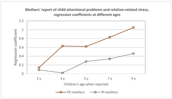A comparison of regression coefficients on the stress–behavior association at each age for the two groups of mothers separately illustrates these interactions. This is exemplified for relation-related stress in Figure 1.