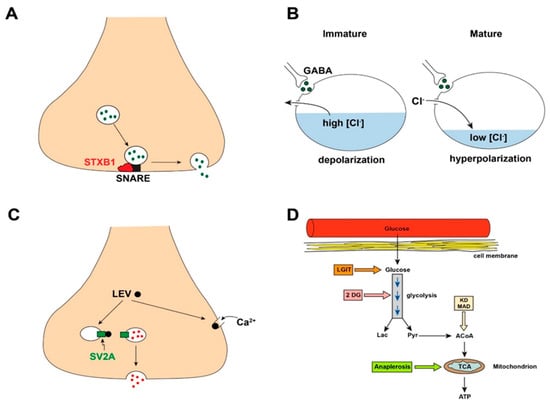 Figure 2. Selected examples of epilepsy mechanisms in which the E/I balance concept may not be immediately applicable. (A) STXBP1 is a protein essential for neurotransmitter vesicle docking and fusion to enable subsequent release of neurotransmitter. This protein binds to the soluble N-ethylmaleimide attachment receptor (SNARE) complex (see text) to allow neurotransmitter release. Mutation of the gene that encodes STXBP1 (STXBP1) impairs neurotransmitter release (both excitatory and inhibitory neurotransmitters) and leads to a syndrome of neurodevelopmental disorder and severe epilepsy. (B) Early in development, GABA is excitatory rather than inhibitory, related in part to age-specific intracellular chloride concentrations. (C) The antiseizure drug levetiracetam (LEV) binds to a synaptic vesicle protein called SV2A, leading to reduced vesicle docking and neurotransmitter release. LEV also inhibits presynaptic N-type calcium channels and release of calcium from intracellular stores. (D) Overview of glucose (Gluc) metabolism. Glucose enters the cell from the bloodstream and then undergoes glycolysis for the eventual production of ATP. Metabolic control points for potential epilepsy therapy are indicated in the boxes. STXBP1, syntaxin-binding protein 1; LGIT, low glycemic index treatment; 2DG, 2-deoxyglucose; KD, ketogenic diet; MAD, modified Atkins diet; ATP, adenosine triphosphate; TCA, tricarboxylic acid cycle; ACoA, acetyl-co-enzyme A; Lac, lactate; Pyr, pyruvate.