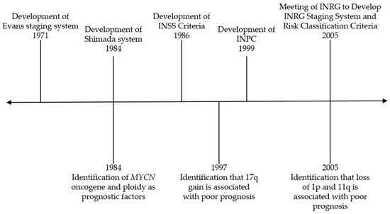 One of the hallmarks of neuroblastoma is its clinical heterogeneity. While children with low-risk disease may be observed or undergo surgery and those with intermediate-risk disease may receive chemotherapy and undergo surgical resection, those with high-risk disease receive intensive, multimodality therapy that includes chemotherapy, surgery, myeloablative chemotherapy with autologous stem cell rescue, radiation, and immunotherapy with an anti-GD2 antibody [1,2,3]. Thus, it is critical to appropriately risk-stratify patients to ensure that they receive the optimal treatment regimen. Over the last several decades, numerous clinical and biologic factors have been incorporated into the risk classification system for neuroblastoma to categorize patients as having low, intermediate, or high-risk disease. Figure 1 illustrates major events contributing to modern risk classification and will be discussed in this review. Efforts have been made to uniformly define risk groups across cooperative groups through the International Neuroblastoma Risk Group (INRG) classification system [4].