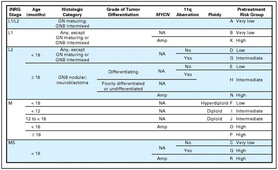 In order to address this problem of non-uniformly defined risk groups, a taskforce was assembled to develop the International Neuroblastoma Risk Group (INRG) classification system [4]. First, a new staging system was established that was based on image-defined risk factors of the original tumor rather than degree of surgical resection and allows for pretreatment risk stratification [13,49]. With the new staging system defined, a new risk stratification system was created as well. This was done by analyzing data collected on 8800 patients diagnosed between 1990 and 2002 in North America, Australia, Europe, and Japan. From this cohort, the most predictive factors were identified including INRG stage, age, histologic category, grade of differentiation, MYCN status, 11q aberration, and tumor cell ploidy. These features were used to define 17 cohorts that were categorized as very low, low, intermediate, or high risk. Patients categorized as very low risk had 5-year EFS of >85%, low from >75% to ≤85%, intermediate from >50 to <75%, and high <50% [4]. These groups were put into a risk stratification table that could be adopted to standardize the risk stratification of neuroblastoma patients (Figure 2).