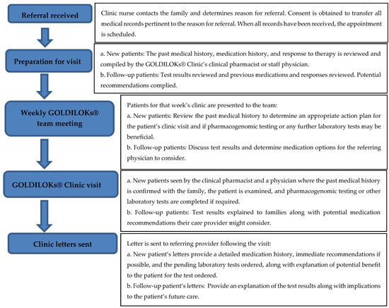 GOLDILOKs® Clinic Operations (Figure 1): Patients are referred to the GOLDILOKs® Clinic via multiple processes, which include internal and external healthcare providers in both medical subspecialties and primary care settings, as well as self-referrals by the patient’s legal guardian. Upon receipt of the referral, the clinic’s nurse coordinator contacts the family to determine the reason for referral and to obtain consent from the legal guardian to transfer all medical records pertinent to the reason for referral, including prior medications and the corresponding response to therapy. Once all the pertinent medical history is received for review, the family is contacted to schedule the initial clinic visit. The past medical history, medication history, and response to therapy is then reviewed and compiled by the GOLDILOKs® Clinic’s clinical pharmacist or staff physicians. This information is presented at the weekly multidisciplinary GOLDILOKs® Clinic’s team meeting. The multidisciplinary team includes nurses, pharmacists, physicians, clinical pharmacologists, clinical pharmacology fellows, and research scientists (Ph.D.). Together the team reviews the patient’s past medical history to determine an appropriate action plan for the patient’s clinic visit and if pharmacogenomic testing or any further laboratory tests may be beneficial. Patients are then seen in the clinic by the clinical pharmacist and a physician, where the past medical history is confirmed with the family, the patient is examined, and pharmacogenomic testing or other laboratory tests are completed if required. Patient information is collected and stored in the GOLDILOKs® Clinic database which is maintained in a Research Electronic Data Capture (REDcap) database (Vanderbilt University, Nashville, TN, USA). REDcap is a password protected database used for our record keeping and tracking of our clinic patients. After the visit is completed, a letter with possible immediate therapy recommendations and pending laboratory results is sent to the referring physician and primary care provider. If applicable, once the results are available for review, the patient is scheduled for a follow-up visit to discuss the meaning of the results and any additional therapy recommendations that might be appropriate for the patient’s care. Thus, patients are typically seen in our clinic twice. The clinic serves in an advisory or consultative capacity to the patient’s prescribing physicians, with specific emphasis on the medication options considering the PK, PD, and pharmacogenetics that might be available.