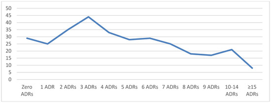 The mean number of medications taken per patient upon initial evaluation in the clinic was 5.2 ± 3.8 (median: 5, mode: 4, range: 0–25). The top 15 medications were Melatonin (n = 74), guanfacine (n = 68), cetirizine (n = 45), methylphenidates (n = 42), fluticasone (n = 41), amphetamine salts (n = 39), clonidine (n = 39), polyethylene glycol 3350 (n = 39), montelukast (n = 34), albuterol (n =3 3), fluoxetine (n = 33), sertraline (n = 30), aripiprazole (n = 26), dexmethylphenidate (n = 23), and trazodone (n = 22). The most commonly used antiepileptics were topiramate, valproic acid, and levetiracetam. Twenty-three patients were on no medications at the time of the first clinic appointment. The mean number of adverse reactions to medications per patient at the first clinic visit was 5 ± 4.1 (median: 4, mode: 3). The number of prior medication adverse reactions at the time of the first visit was variable, ranging from 0 to 34 (Figure 2).