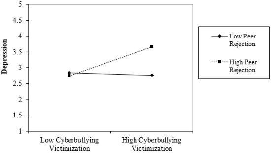 Graphical representation of the interaction between cyberbullying victimization and peer rejection for depression.