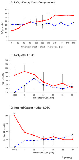 Interrupted line represents 21% and continuous line 100% oxygen. Data presented as average and standard deviation. (A) Arterial oxygenation (PaO2 mm Hg) during chest compressions (CC). (B) Arterial oxygenation (PaO2 mm Hg) after return of spontaneous circulation (ROSC). (C) The change in fraction of inspired oxygen after ROSC.