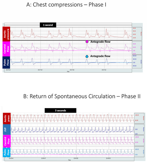 (A) BIOPAC snapshot of blood flow during the chest compression; (B) BIOPAC snapshot of blood flow after ROSC.