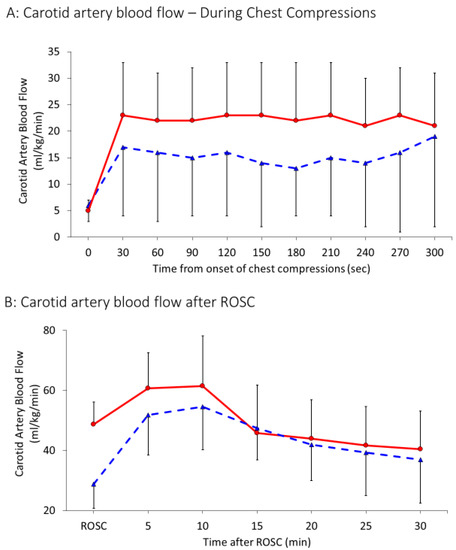 Interrupted line represents 21% and continuous line 100% oxygen. Data presented as average and standard deviation. (A) Carotid blood flow in mL/kg/min during CC. (B) Carotid blood flow in mL/kg/min after ROSC.