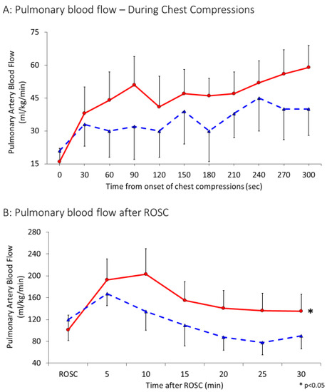 Interrupted line represents 21% and continuous line 100% oxygen. Data presented as average and standard deviation. (A) Pulmonary blood flow in mL/kg/min during CC. (B) Pulmonary blood flow after ROSC.