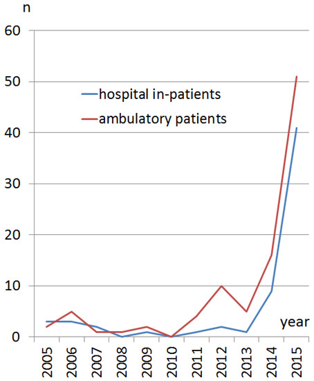 Number of refugee children treated at our department from January 2005 until December 2015. The blue line represents inpatients, the red line represents ambulatory patients. A sharp rise is evident in the years 2014 and 2015.