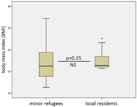 Comparison of body mass index (BMI) between refugees (left) and locally residing in-house patients. While the mean values were similar at 16.2 versus 16.3 (p = 0.25, nonsignificant (NS)), the range was greater in the minor refugee group.