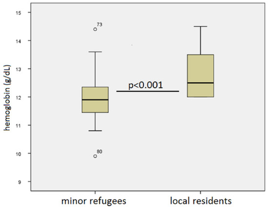 As demonstrated in Figure 3, hemoglobin levels were significantly lower in the refugee cohort compared to the local population (mean 11.95 ± 0.9 g/dL versus mean 12.79 ± 0.8 g/dL, respectively, p < 0.001). Anemia, according to age-adjusted nomograms [4,5] was present in 16% of refugee children versus 3% of the locally resident inpatient population. No other differences in laboratory parameters were found.