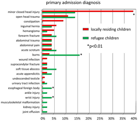Relative proportion of admission diagnoses of refugee children (in green) and locally residing patients (in red) admitted to pediatric surgery from January 2005 until December 2015. While minor closed head injuries were more common in locals, refugees were more likely to be diagnosed with burns, esophageal foreign bodies, wrist injuries, and other types of trauma combined.