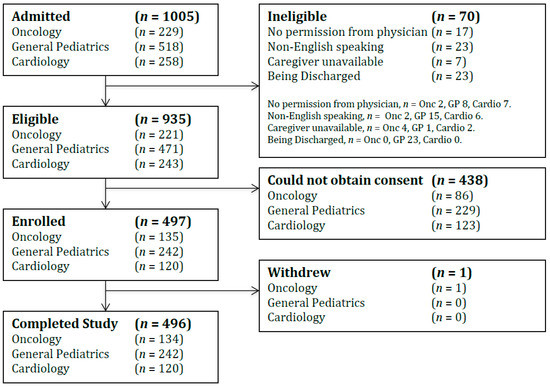There were 1005 patients admitted to the three participating study services during the observation period. Seventy patients (7.0%) were ineligible due to lack of permission from the care team, lack of ability to communicate in English, or their length of stay was outside of the two- to 30-day range (Figure 1). Of the 935 eligible patients, 438 (46.8%) were not enrolled due to lack of assent/consent from the patient or caregiver. An observational cohort of 497 (53.2%) patients was enrolled, and 496 (99.8%) completed the study (Figure 1). Study participants were 48.2% female, 57.9% Caucasian, 8.7% First Nations, 8.5% Filipino with the remainder split between African, Arab, Chinese, East Indian, Latin American and Others. Participants had a mean (SD) age of 5.1 (5.7) years. The mean (SD; range) ages of patients in oncology, general pediatrics and cardiology were 8.6 (5.9; 18 days–17.5 years), 4.2 (5.3; 6 days–16.9 years) and 2.6 (4.0; 4 days–16.9 years) years respectively. The average non-verbal age was 1.3 years (range: 4 days to 15 years). The average verbal age was 11.5 years (range: 3.7 years to 17.5 years). The proportion of patients on their first admission was greatest in cardiology (57.5%), compared to general pediatrics (35.9%) and oncology (14.2%). The median (IQR) length of stay was 3 days (2–6) for oncology, 4 (3–8) for general pediatrics and 3 (2–9) for cardiology (Table 1).