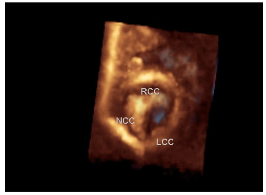Valvular aortic stenosis with a bicuspid valve. A full volume rendered three-dimensional echocardiographic “surgeon’s view” of a bicuspid aortic valve in systole showing fused right (RCC) and noncoronary (NCC) cusps with prominent ridge, a smaller left coronary cusp (LCC) (lower to the orifice) and an eccentric elliptical restricted orifice (in light blue color).