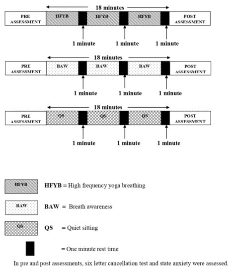 There were 3 interventions which each group practiced in 3 days in random order. These were (i) high frequency yoga breathing or HFYB, (ii) breath awareness (BAW), and (iii) quiet sitting (QS).