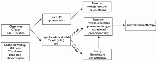 Optimal timing for surgery and chemotherapy is dependent upon the type of PPB. Upfront resection is desirable in type I/Ir tumors, with the decision to append chemotherapy onto treatment, dependent upon such considerations as discussed above [5]. For type II/III tumors, consideration must be given to the anatomy of the tumor itself. If a tumor is amenable to complete early resection, this approach is preferred. Up-front complete PPB resection at diagnosis is desirable when at all possible, but pre-operative chemotherapy may be necessary in instances where this is not possible or presents an unacceptable risk to the patient. Although tumor size itself does not appear to correlate directly with outcome, Type II or III PPB larger than 10 cm may be exceedingly difficult to resect with negative margins. The European Cooperative Study Group for Paediatric Rare Tumors (EXPeRT) has identified a threshold of 10 cm as a reasonable cut-off point, above which up-front biopsy followed by neoadjuvant chemotherapy is a reasonable approach (Figure 2) [24]. Complete resection at diagnosis is associated with improved prognosis; however, no prospective studies examining the timing of resection and chemotherapy exist [24]. PPBs are relatively chemo-sensitive tumors, and a dramatic reduction in tumor volume between 40%–90% is often seen with neoadjuvant chemotherapy [1]. Close coordination between medical and surgical oncology services is advisable, however, the response to chemotherapy is often ephemeral and thus, rapid reoccurrence may be expected [1,5,24]. The current IPPBR protocol recommends resection occurs at Week 10, following three cycles of neoadjuvant chemotherapy and subsequent hematologic recovery.