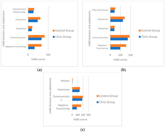 We also have to take into consideration that the mothers’ education was different when comparing the clinical and control groups, and that this variable could be associated with the children’s developmental tasks. We, therefore, ran a series of Spearman’s correlations in the clinical and control groups between mothers’ schooling years and VABS domain scores. None of these statistical analyses obtained significance (p > 0.05). We concluded that this variable does not have a significant association with children’s developmental tasks (Table 3).