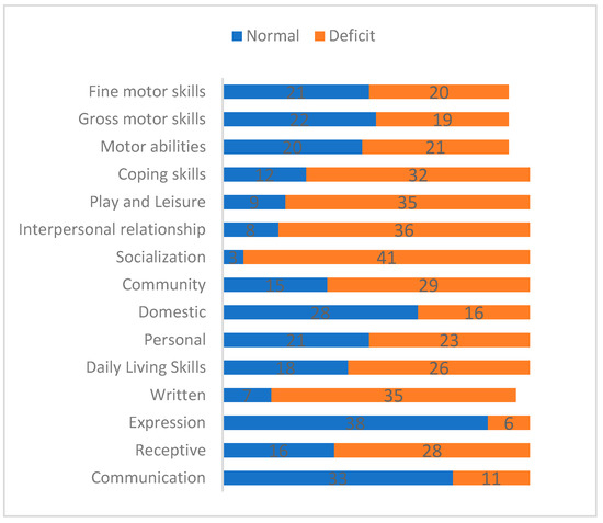 The Play and Leisure subscale showed lower clusters in the clinical sample, especially when following/respecting the rules of play, participating in games and going out with friends. Sharing/cooperation and watching TV were relatively unaffected, except sharing toys or other personal items with or without being reminded to do so and the recognition of the name of at least one favorite TV program and the day and channel on which it is broadcasted. Furthermore, the Coping skills subscale presented lower levels, specifically about respect for the rules, conversational rules, and responsible time management.