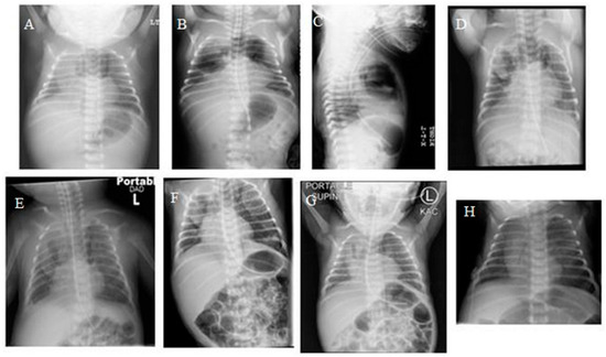 - Lee, C.C.; Tsao, P.P.; Peng, S.S.; Jeng, S.S.; Chou, H.H.; Chen, C.C.; Hsieh, W.W. Spontaneous multiseptated cystic pneumomediastinum in a term newborn. Pediatr. Neonatol. 2008, 49, 197–200. [Google Scholar] [CrossRef]