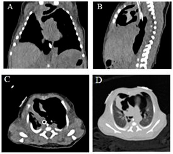- Low, A.A.; Tan-Kendrick, A.A.; Loh, M.; Chui, C.C. Spontaneous multiloculated multiseptated pneumomediastinum in a newborn baby: The spinnaker sail is rigged-CT features with pathologic correlation. Pediatr. Radiol. 2003, 33, 712–715. [Google Scholar] [CrossRef] [PubMed]