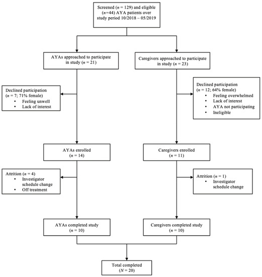 Inclusion criteria for the AYA group was as follows: (1) English-speaking, (2) age of 15–29 years, and (3) currently receiving medical treatment (at any time point) at the cancer center for any cancer diagnosis. Inclusion criteria for the caregiver group was as follows: (1) English-speaking, (2) primary caregiver for an AYA patient, and (3) AYA child/spouse is receiving medical treatment (at any time point) at the cancer center for any cancer diagnosis. Exclusion criteria included (1) patients and/or caregivers displaying symptoms of delirium or psychosis that precluded their ability to participate in the qualitative interview or provide consent/assent, and (2) patients and/or caregivers with intellectual disability that precluded their ability to participate in the qualitative interview or provide consent/assent. Caregivers could participate even if their AYA child did not. “Treatment” was defined as active chemotherapy and/or radiation, or less than 100 days post-bone marrow transplant. Treatment status was determined through review of patient electronic medical records (EMRs). Over the course of 7 months, 14 AYAs and 11 parents were enrolled (see Figure 1).