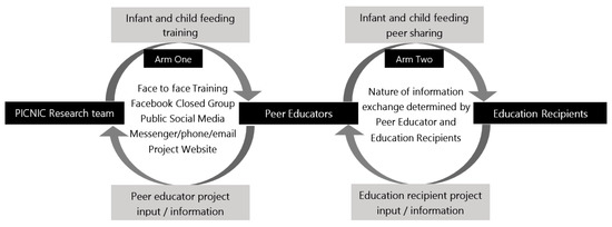 The primary aim of the PICNIC study is to assess the effect of a peer education model supported by a website and social media on infant/child diet quality and their parents’ feeding practices. The secondary aim is to describe the perceptions of primary caregivers who have participated in the study as a peer educator or had their role in infant feeding supported by a peer education model with face-to-face, website and social media components. Figure 1 provides an overall summary of this study.