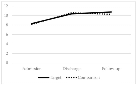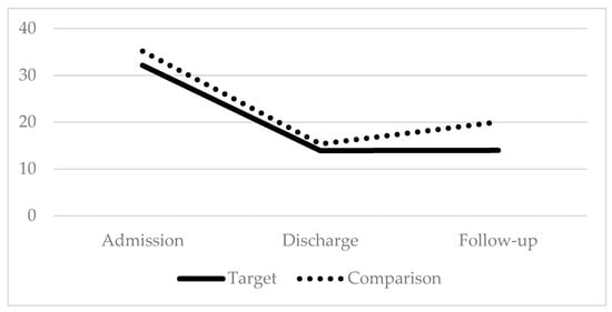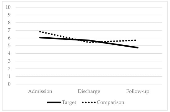 Paired t-tests were conducted to evaluate the efficacy of this parent training component in promoting maintenance of children’s functional gains after discharge from IIPT by comparing outcome measures of 36 children who completed the IIPT program and whose parents received the intervention (target group) to a matched control sample of 36 children who completed the IIPT program prior to the additional implementation of the parent intervention (comparison group). Results indicated that patients in both groups made similar gains during the program on disability and coping (p > 0.05); additionally, patients in the comparison group saw greater change in pain than patients in the target group, t(70) = −2.91, p < 0.01. However, at follow-up, patients in the target group maintained program gains for disability, coping, and pain and demonstrated significantly greater improvement than patients in the comparison group did for disability t(70) = 2.24, p < 0.05, coping t(68) = 2.13, p < 0.05, and pain t(70) = 2.56, p < 0.05 (see Figure 1, Figure 2 and Figure 3).