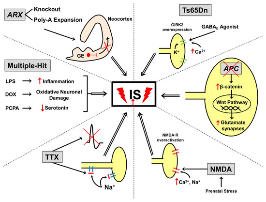 IS affect 2–5/10,000 infants, which makes it the most frequent epilepsy beginning during the first year of life [6,7]. IS occurrence within this specific age window has definite mechanistic implications. The etiology of IS can be symptomatic (known cause) or cryptogenic (no known cause), though with advances in genetics, imaging, and other diagnostic tools, the proportion of cryptogenic cases is decreasing over time. IS can occur in full term infants, as well as those born prematurely (in which case the most common associated causes are periventricular leukomalacia and intraventricular hemorrhage) [8,9]. The outcome of IS is usually poorer in symptomatic cases. The causes of IS are heterogeneous—over 200 etiologies have been linked to IS, spanning the spectrum from acquired brain injury (e.g., perinatal hypoxia ischemia, intracranial hemorrhage) to mutations in genes regulating the development of ion channels, synaptogenesis, neuronal migration, and circuit formation [10,11,12]. The current first-line treatments include ACTH, corticosteroids, and vigabatrin; the ketogenic diet has also shown some efficacy [13,14,15]. The usual response to treatment with ACTH or corticosteroids is “all-or-none”—the spasms and hypsarrhythmia subside, or no improvement is seen at all. This observation needs to be considered when explaining the mechanism of action of these agents in IS. However, these drugs are ineffective in at least 30% of patients and they are associated with potentially severe side effects [16,17,18]. It is possible that trials combining multiple mechanisms of action (e.g., ACTH plus vigabatrin) might be beneficial in IS, and animal studies could be used to screen such potential therapies. However, to date, such combination therapy has not been shown to significantly improve developmental outcome [19]. The poor prognosis of patients with IS and the inadequacy of current therapies pose great challenges to clinicians and highlight the dire need for a better understanding of the syndrome to create more potent treatments. At present, the pathophysiology of IS remains elusive.