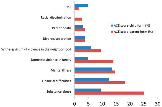The most common adverse experience that children were exposed to was having lived with a caregiver who was mentally ill, suicidal or severely depressed (13.46%), followed by having lived in a household where the family income was inadequate to cover the basic necessities, such as food and housing (12.5%). The most common adverse experience parents had been exposed to while they were children, was having lived with a caregiver who had problem with alcohol or drugs (25%); next was having lived in a household where the family income was inadequate to cover the basic necessities, such as food and housing (18.27%) (Figure 2).