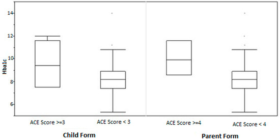 HbA1c was found to be significantly higher among those children who had exposure to three or more adverse experiences compared to those with exposure to less than three adverse experiences (9.66% (12.8 mmol/mol) versus 8.19% (66.0 mmol/mol); β: 0.63 (4.5 mmol/mol); 95% CI: 0.11–1.15 (1.08–10.2 mmol/mol); p = 0.02), after adjusting for age, gender, insurance type and BMI z-score (Table 2). We also found that HbA1c was significantly higher among children who had lived with parents who had exposure to four or more adverse experiences during their childhood compared to those with exposure to less than four adverse experiences, (10.03% (86.1 mmol/mol) versus 8.24% (66.6 mmol/mol); β: 0.87 (7.2 mmol/mol); 95% CI: 0.11–1.63 (0.96–15.5 mmol/mol); p = 0.03), after adjusting for age, gender, insurance type and BMI z-score (Figure 3).