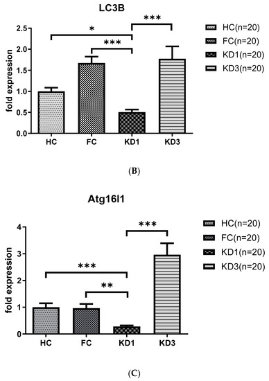 Analyses of mRNA autophagy markers in the peripheral white blood cells of Kawasaki disease (KD) patients before and after IVIG treatment. Total RNA from the peripheral white blood cells of healthy controls (HC, n = 20), febrile controls (FC, n = 20) and KD patients before (KD1, n = 20) and after (KD3, n = 20) IVIG treatment were isolated using a total RNA purification kit. Reverse transcription was performed using a high-performance reverse transcriptase system as described in the Methods section. The levels of BECN 1 (A), LC3B (B) and ATG16L1 (C) mRNA was measured by a real-time quantitative polymerase chain reaction (RT-qPCR). The expression levels were normalized to those of GAPDH. The comparisons among these groups were analyzed. Data are expressed as mean ± standard error. * p < 0.05, ** p < 0.01, *** p < 0.001 (by Kruskal–Wallis one-way analysis of variance).
