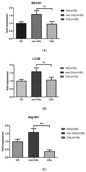 As shown in Figure 2, KD patients with CAL (CAL; n = 10) had persistent downregulated levels of ATG16L1 mRNA (0.38 ± 0.04 vs. 2.85 ± 0.46, p < 0.01) compared to the age-matched KD patients without CAL (non CAL; n = 20) 21 days after IVIG therapy; while the levels of BECN 1 and LC3B mRNA not significantly different between the aforementioned groups.