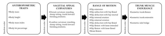 All the CEA were asymptomatic at the time of the evaluation session. The CEA were examined wearing sports clothes and without shoes. The risk factors under study were classified in four categories (Figure 1) that were evaluated always according to the following temporal order: anthropometry traits, sagittal spinal curvatures, hip and knee ROMs and muscle endurance. However, measurements performed within each category were performed in a random order (Figure 1). All these parameters were assessed by experienced examiners. Two measurements were taken of each parameter, except for the trunk muscle endurance, which was measured only once. The mean score for each test was used in the statistical analysis. The CEA were allowed to rest for 60 s between repetitions, between evaluation of both corporal sides and for 3 min between tests.