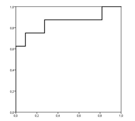 Receiver operating characteristic (ROC) curve analysis for body fat as a risk factor for lower back pain. The area under the curve is 0.852 (p = 0.01); the coordinates represent a possible cutoff point in body fat (the optimal cutoff point was 23%).
