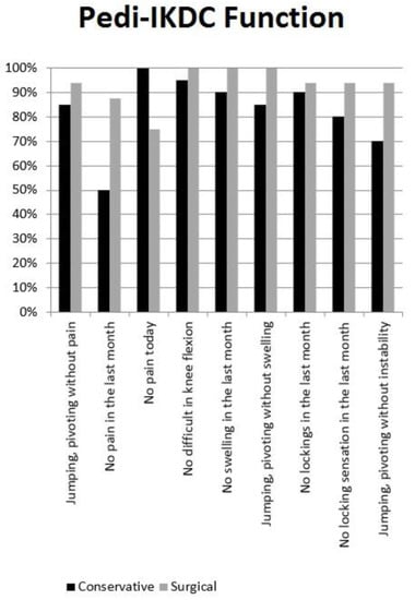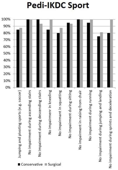 Thirty-six patients (84%) were available for subjective clinical evaluation at an average follow-up of 6.4 ± 3.3 years (range 2–12). Among the non-participants, five patients were definitely unreachable by phone, e-mail, or letter, while only one patient refused to be included in the study because he said he was unsatisfied with care. The average Pedi-IKDC was 96.4 ± 5.7, with no significant differences between surgically or conservatively treated patients (Table 3). Between 80% to 100% of patients reported the highest score in most of Pedi-IKDC “function” items, with the lowest performance reported for pain and instability during jumping or pivoting in patients who were managed nonoperatively (Figure 2). Only a minimal impairment was reported in the Pedi-IKDC “sport” items, mostly during jumping and landing (Figure 3).