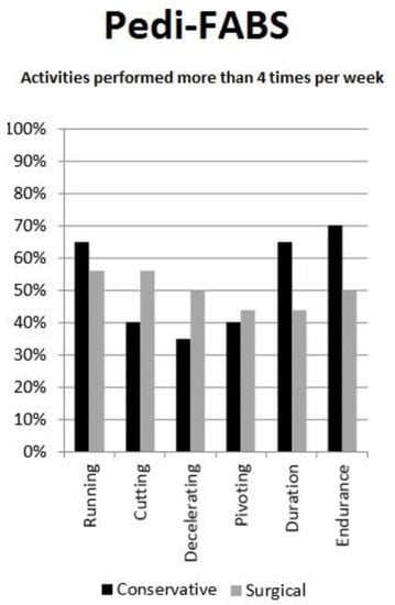Twenty-eight patients (78%) returned to their previous level of sport activity (eight amateur, 13 competitive, seven elite level) (Table 4). Among the eight patients that quit sports, one did so because he started working and seven out of fear of a re-injury without complaining of any knee pain or instability. The average Pedi-FASB was 22.2 ± 5.9, with no significant differences among the two treatments (p = 0.32). Nearly 30–40% reported to be engaging in running, pivoting, and cutting activities more than four times per week (Figure 4).