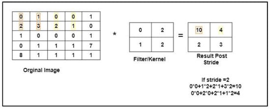 It is the number of picture elements the kernel/filter shifts over the input at a time. Figure 3 shows an example of how the stride process works. In the example, the filter convolved around the input by shifting two units at a time. To calculate the first block of the resulting image after a stride operation with stride = 2 was performed. We applied a cross product between the image pixel and the filter pixel as (0 × 0) + (1 × 2) + (2 × 1) + (3 × 2) = 10; such that the first number (in orange color) was the image pixel and second number (in blue color) was the filter pixel.