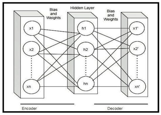 The autoencoder is a type of neural network that does not require the labeling of data, and therefore it is an unsupervised learning algorithm. The aim is to learn an input function to reconstruct the input to an output of fewer dimensions. It approximates the identity function to get the outcome of a neural network similar to the input. In order words, it tries to copy the input to its output. Mathematically, if x is the input (also called an encoder), x’ is the network (also called a decoder). The architecture of autoencoders reduces dimensionality using non-linear optimization. In Equation (1), h is the hidden layer, which can be calculated by multiplying the vector x with weights and adding the bias and passing it to the activation function. The decoder x’ is calculated in Equation (2).