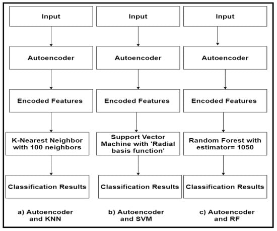 The input fMRI was fed to the Pearson’s correlation function to compute the pairwise correlation. This data was provided as input to an autoencoder, which will help extract lower-dimensional features (in our case, 4975 features from 9950) to send it to the classification models. In the paper, we focused on using four main classifiers, including KNN, SVM, RF, and CNN. Figure 7 shows the flowchart of combing the autoencoder and the adopted machine learning classifiers. In the autoencoder–KNN model, for calculating the distance between k points, the value of p was set to 2, which was for the Euclidean distance and 100 neighbours. For the autoencoder–SVM model, in the parameter list, we chose C = 2.0, which is a regularization parameter. For the autoencoder–RF model, we assigned the estimators value to 1050 and the depth value to 90.