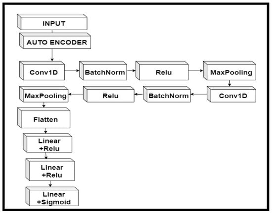 In the proposed autoencoder–CNN, the CNN consisted of two 1D convolution layer followed by batch normalization, an activation function, and a max pooling layer. After flattening the CNN layer, it worked as a fully connected neural network, and we had two linear layers with an activation function. Since the output predicts whether an individual is diagnosed with autism or not, we applied the sigmoid activation function. Figure 8 shows the workflow of combining an autoencoder with CNN.