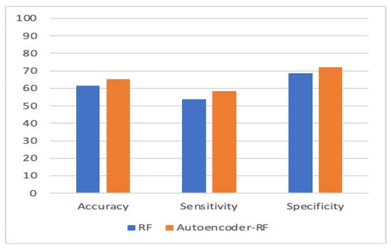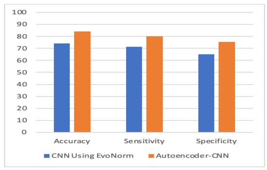 Figure 10, Figure 11, Figure 12 and Figure 13 compare the performance of the proposed hybrid models against individual classifiers. We could observe that the hybrid autoencoder-based models outperformed the individual methods measured by the increased value of the accuracy, sensitivity, and the low values of the specificity measures. The Receiver Operating Characteristic (ROC) curve for each hybrid model, compared to the individual classifier, is shown in Figure 14, Figure 15, Figure 16 and Figure 17. We could observe that the ROC curve for autoencoder–CNN was better than any other model. ROC is a probability curve, and AUC represents the degree or measure of separability. The higher the AUC, the better the model was at the prediction.