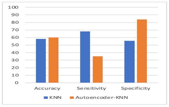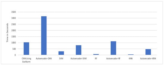 The experimental results in Figure 18 show that the autoencoder with CNN was the best performing hybrid model for our problem. The computational time taken by each model is illustrated in Figure 19. The autoencoder combined with CNN has the highest computational time for training, while the autoencoder–KNN had the lowest computational time.
