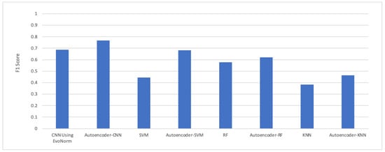 The F1 score was also calculated for all the proposed models, as shown in Figure 18. CNN achieved better results compared to other models. The F1 score can be interpreted as a weighted average of precision and recall. The relative contribution of precision and recall to the F1 score are equal. The F1 score [39,40] is calculated as: