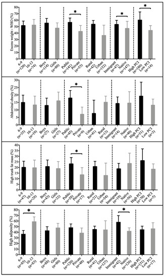 Figure 2 indicates the association between different status in the anthropometric categorical variables of the study and the age group, sex, type of schooling, per capita income, area of residence and immigrant status. Therefore, no statistically significant association was shown in the case of BMI, WC, and WHtR according to age group and sex. Conversely, a higher association of excess weight was found in children from public schools, as well as of having abdominal obesity. Lower association of having an inadequate %BF were found in the participants aged 6–9 and in boys, in those from private schools, in the low per capita income group, in children from rural areas, and in native students (only statistical significance in the case of age group and immigration). Information on odds ratio and 95% confident intervals is presented in Table S2.